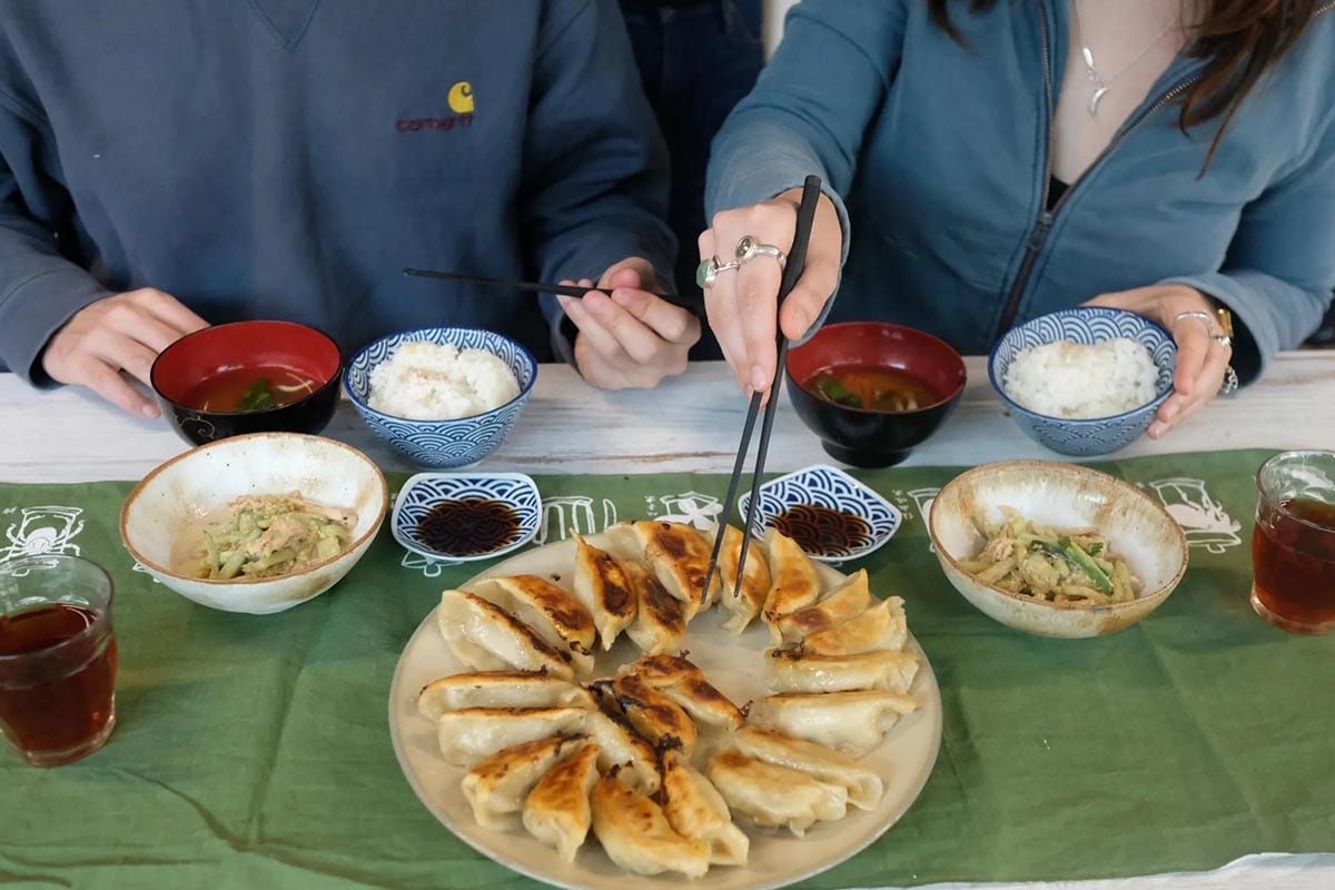 Next is the cooking stage: you will discover the yaki-gyoza method, which combines a crispy base with steaming. Once the gyoza are ready, you will get to taste them in a relaxed atmosphere with Japanese accompaniments and tea.