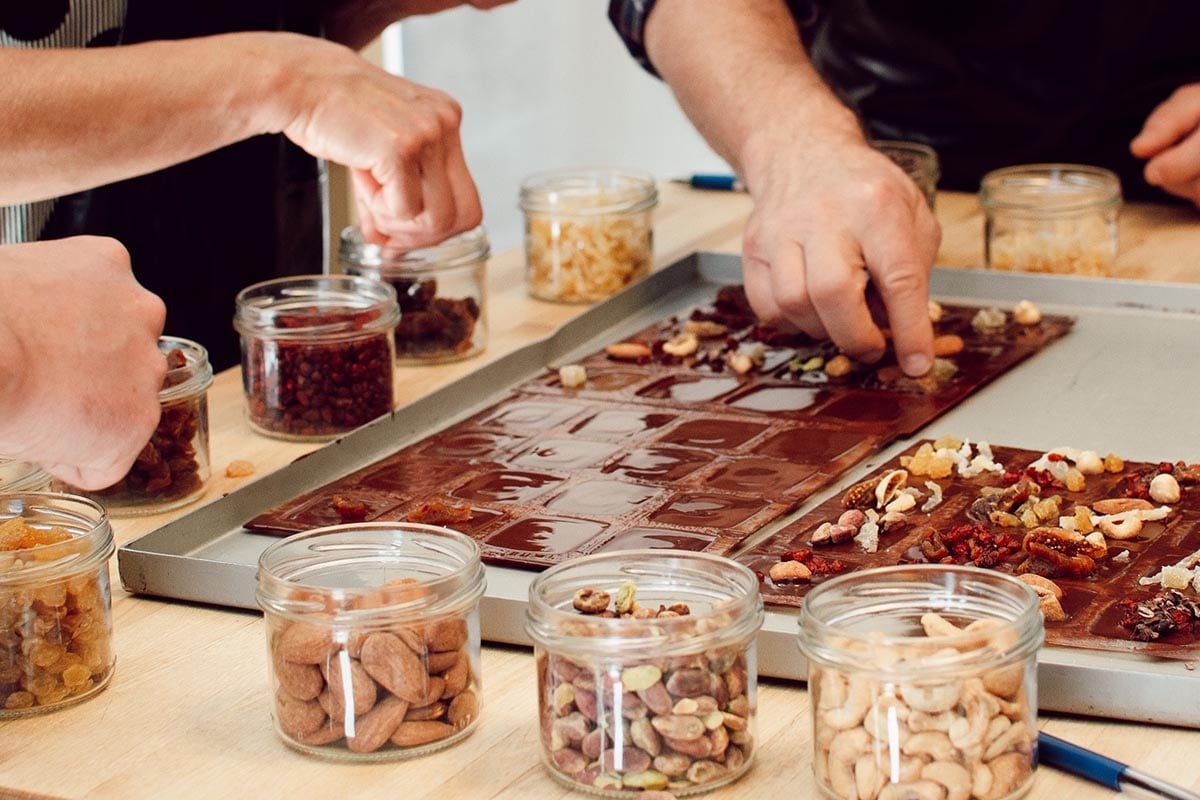 Creating your own mendiants (small rectangles of dark chocolate decorated with dried fruits): put on your apron, mold, create, unmold, package, and taste!